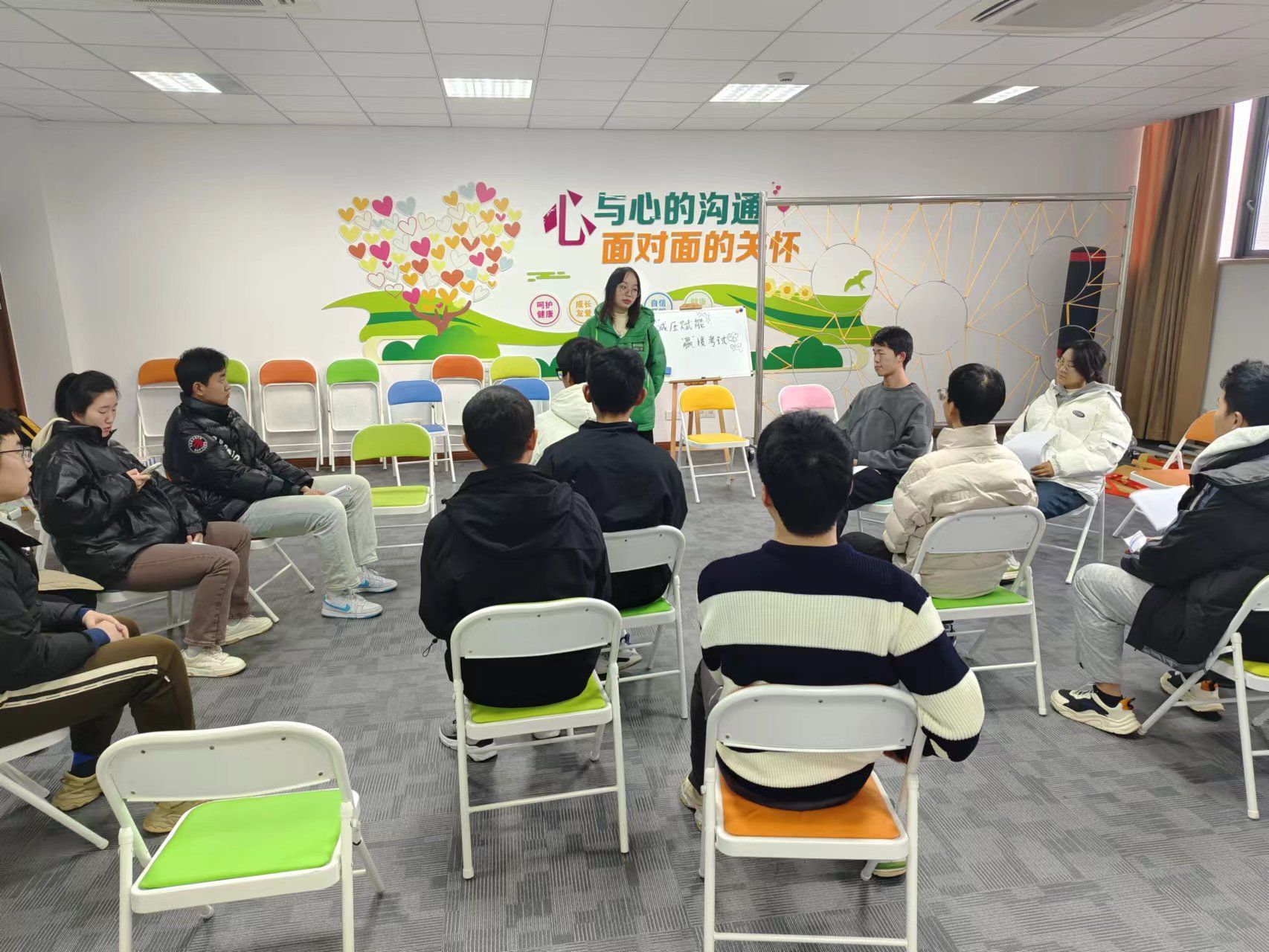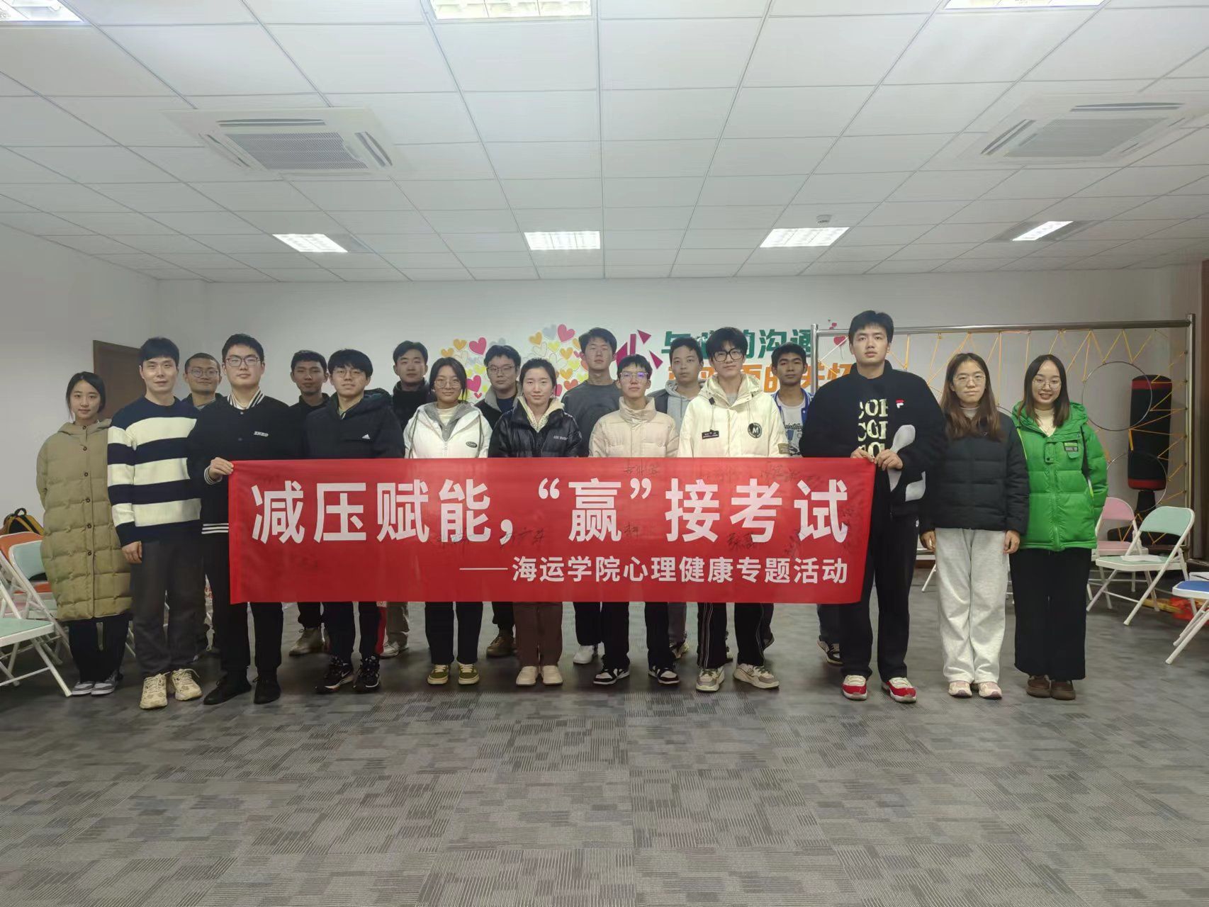 在考试月来临之际,为缓解学生备考压力,促进学生身心健康发展,提高学生心理健康调节能力,培养学生良好心理品质,12月27日下午,海运威尼斯人网 组织40余名学生分两批开展“减压赋能,‘赢’接考试”的减压团辅主题活动。