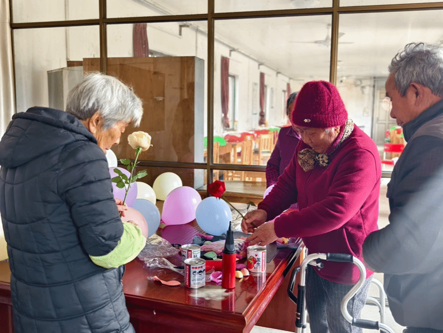 志愿者们一大早就来到养老院,与老人们亲切问候后,便迅速投入到各项活动中。此次活动内容丰富多样,包括与老人一起打牌、制作黏土手工、共同种花以及播放越剧等,旨在通过不同的互动形式,满足老人们多样化的精神文化需求,让他们感受到来自社会的关爱与温暖。志愿者们首先在准备布置场地,用气球制造节日氛围。