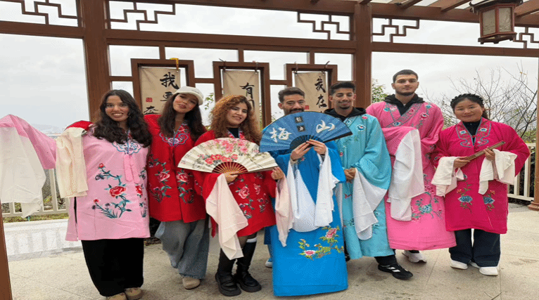 随后,团队前往梅港村参与越剧文化体验活动。在专业老师的带领下,同学们初步了解了越剧的发展历史与艺术特色,并学唱了经典剧目《梁祝》的选段。尽管语言存在一定障碍,但在老师逐句示范与耐心指导下,同学们逐渐跟上节奏,尝试用越剧唱腔表达情感,现场氛围轻松而热烈。这一环节不仅让大家领略了中国戏曲的婉转优美,也加深了对浙江地方文化的直观理解。