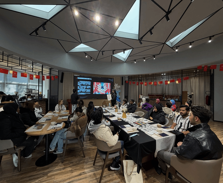 活动伊始,指导老师为同学们开启了一段精彩的“敦煌文化导览”。老师从丝绸之路的历史讲起,深入浅出地介绍了敦煌莫高窟的千年辉煌、岩彩画的起源、所用矿石颜料的独特质感及其所承载的文化传承意义。国际学生们听得津津有味,对壁画中飞天仙子的飘逸、九色神鹿的灵动以及绚烂色彩的背后故事表现出浓厚的兴趣,不仅增长了知识,更对中华传统文化的深厚底蕴赞叹不已。