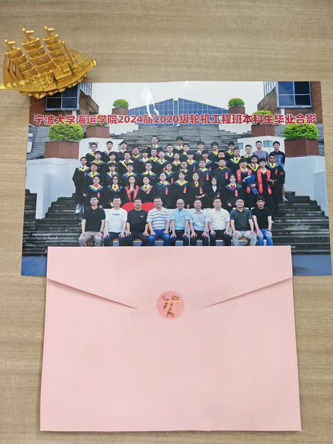 一封信锚定初心,结合海运行业发展趋势,勉励学子投身海洋强国建设;模型船承载梦想,船身镌刻毕业生姓名,成为连接母校与学子的独特文化符号;毕业照镌刻青春,背景融入“南天门”等特色育人工程元素,希望同学们如鲤鱼跃龙门般披荆斩棘。