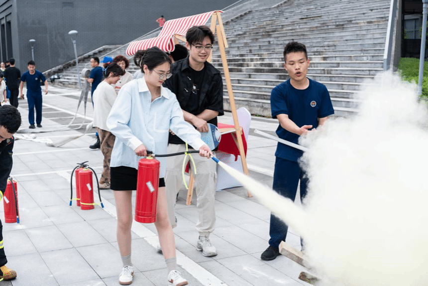 随后的消防嘉年华环节中,消防官兵向师生们展示了消防器材和装备,并进行了灭火器使用现场讲解。师生们积极参与了灭火器使用、打绳结、穿脱消防服等体验活动,还参与了水带“保龄球”、消防安全知识答题等互动小游戏。消防嘉年华通过寓教于乐的方式,提高了大家的消防安全意识和自防自救能力。