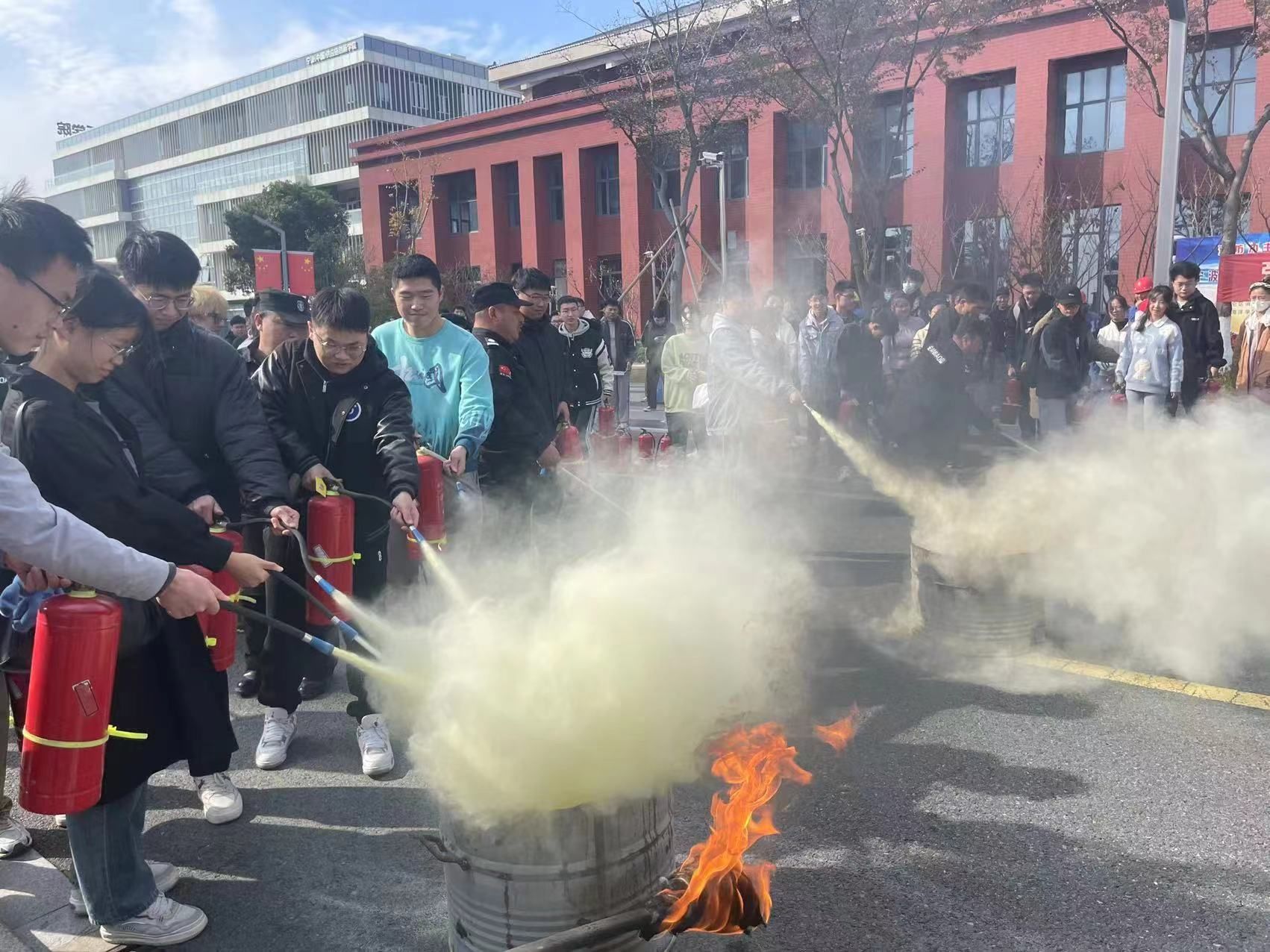 随后,专业人员在行政楼前给大家介绍了灭火器的分类,演示了灭火器的操作步骤,包括拔掉保险销、对准火源、均匀喷射等关键动作。特别强调了在紧急情况下正确操作灭火器的重要性。通过近距离、沉浸式的互动学习,在场师生们对消防器材的使用方法和使用技巧有了更加深刻的认识。接着,大家踊跃有序地进行了现场灭火的实际操作。